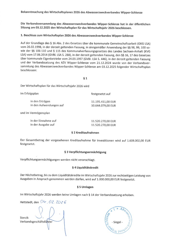 Der Wirtschaftsplan liegt nach § 16 Abs. 4 EigBG LSA vom 05.02.2026 bis zum 20.02.2026 zur Einsichtnahme während der Dienstzeiten in der Geschäftsstelle des Abwasserzweckverbandes Wipper-Schlenze, Sanderslebener Straße 40 in 06333 Hettstedt öffentlich aus.